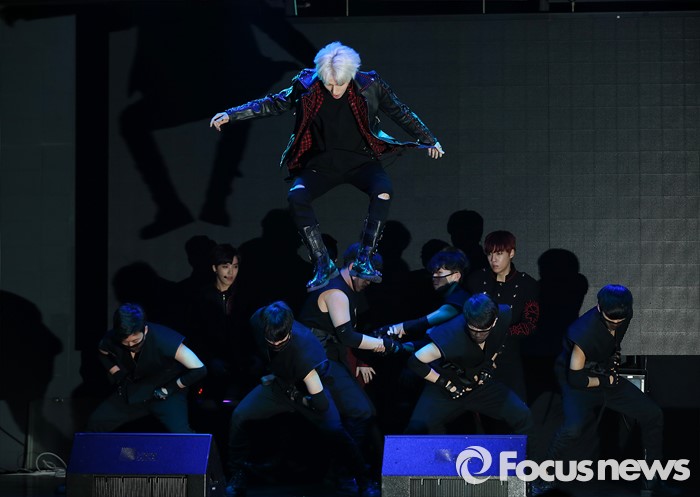 (서울=포커스뉴스) 30일 오후 서울 마포구 예스24 무브홀에서 열린 아이돌그룹 소년공화국의 세번째 미니앨범 [BR: evolution] 발표 쇼케이스에 참석한 멤버 민수가 'Get Down'무대를 선보이고 있다.