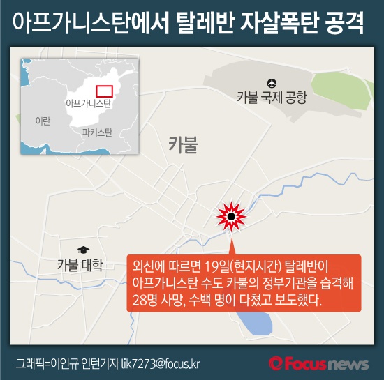 (서울=포커스뉴스) 외신에 따르면 19일(현지시간) 탈레반이 자동차를 이용한 자살 폭탄 공격과 총격을 퍼부으며 아프가니스탄 수도 카불의 정부기관을 습격해 28명이 사망하고 수백 명이 다쳤다고 보도했다.
