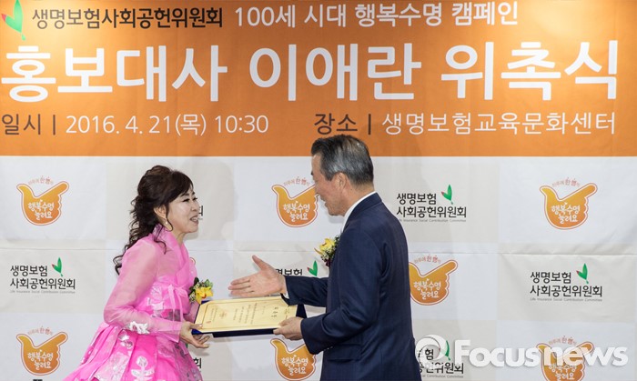 (서울=포커스뉴스) 21일 오전 서울 종로구 센터포인트빌딩에서 열린 '생명보험사회공헌위원회 '100세 시대 행복수명 캠페인' 홍보대사 위촉식에 참석한 가수 이애란(왼쪽)이 이수창 위원장에게 위촉장을 받고 있다.