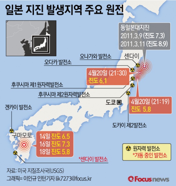 (서울=포커스뉴스) 2011년 동아시아 대지진 이후 최근 발생한 일본 지진발생 지역과 주요 원전 위치.