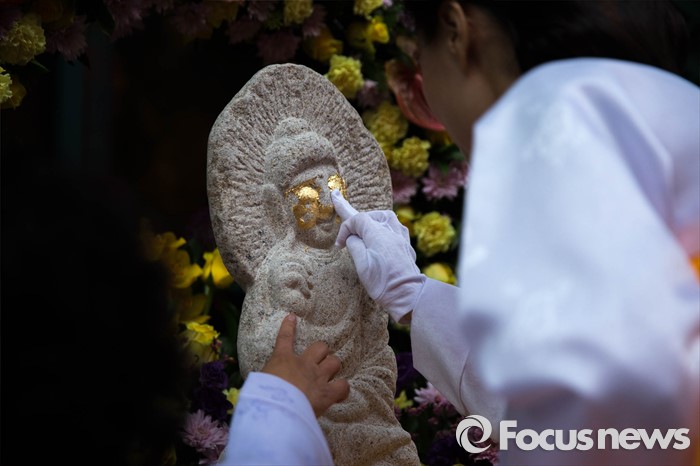 (서울=포커스뉴스) 21일 오전 서울 종로구 조계사에서 금박공양 의식이 진행되고 있다.