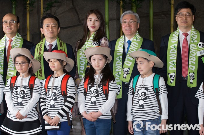(용인=포커스뉴스) 21일 오전 경기도 용인시 에버랜드에서 열린 '판다월드 개관식'에서 정연만(왼쪽부터) 환경부 차관, 남경필 경기도지사, 미쓰에이 수지, 김종덕 문화체육관광부 장관, 탄광민 중국 국가 임업국 사장(차관급)이 기념촬영을 하고 있다.