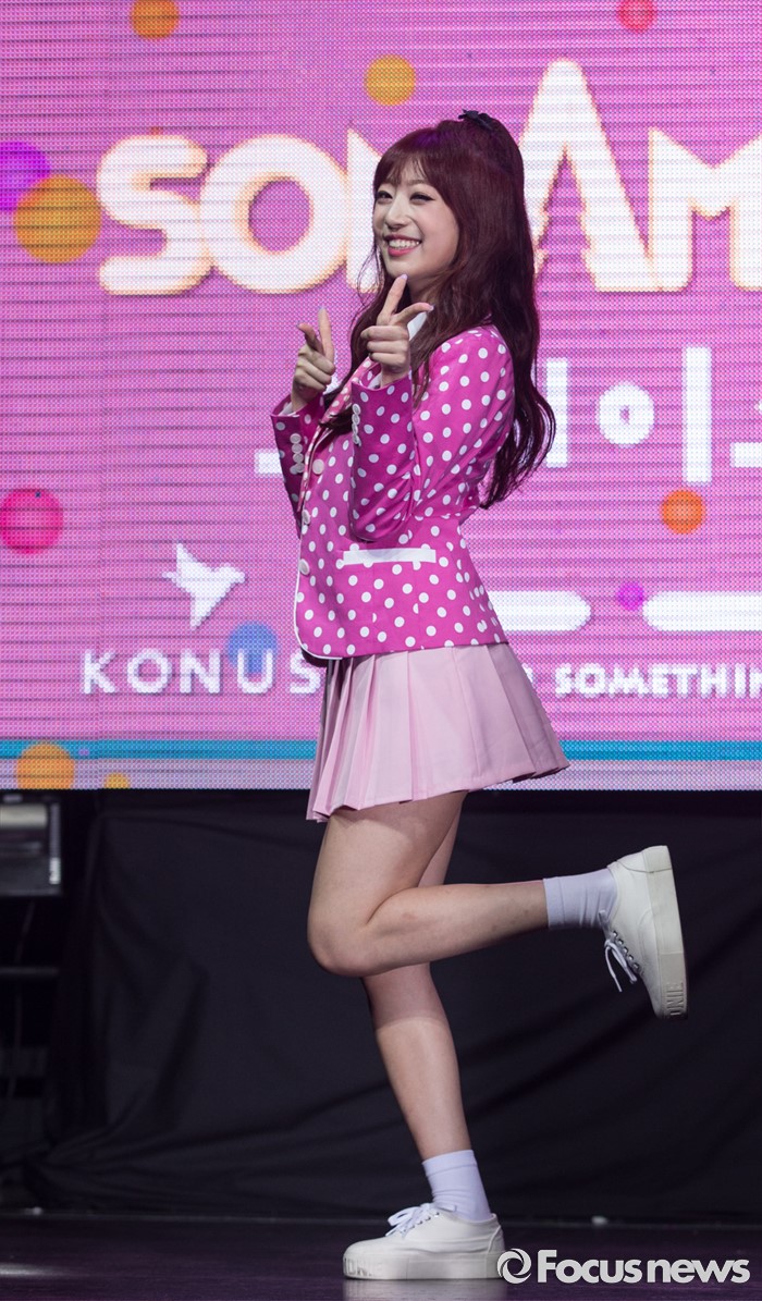 (서울=포커스뉴스) 29일 오전 서울 마포구 예스24 무브홀에서 열린 걸그룹 소나무의 미니앨범 '넘나 좋은 것' 쇼케이스에 참여한 멤버 수민이 포토타임을 갖고 있다.