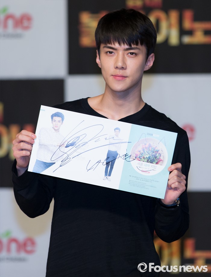 (서울=포커스뉴스) 29일 오후 서울 강남구 일지아트홀에서 열린 '굽네 볼케이노와 함께하는 엑소(EXO) 치밥 쿠킹 팬사인회'에서 세훈이 포즈를 취하고 있다.