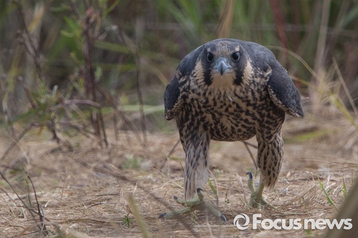(인천=포커스뉴스)송골매 유조 암컷이 인천 수도권 매립지 풀섶을 거닐고 있다.