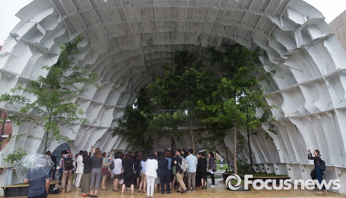 (서울=포커스뉴스) 5일 오전 서울 종로구 국립현대미술관 서울관에서 열린 '젊은 건축가 프로그램 2016' 기자간담회에 참여한 취재진들이 신형철 건축가의 Temp'L'을 둘러보고 있다.