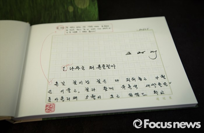 (서울=포커스뉴스) 12일 오전 서울 중구 한국프레스센터에서 열린 조정래 작가의 '풀꽃도 꽃이다' 출간기념 기자간담회에 작가가 직접 작성했던 원고지 노트가 놓여져 있다.