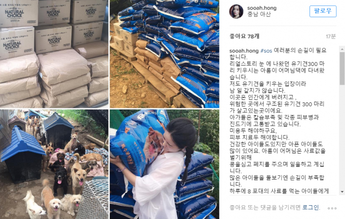 홍수아는 사진과 함께 올린 장문의 글을 통해 "300여마리의 유기견이 칼슘 부족 및 각종 피부병에 시달리고 있다. 유기견을 키우는 입장에서 남 일 같지 않다. 작은 보탬이 되고 싶어 진드기 치료제·심장사상충 예방약을 전달하고 돌아왔다"고 밝혔다.