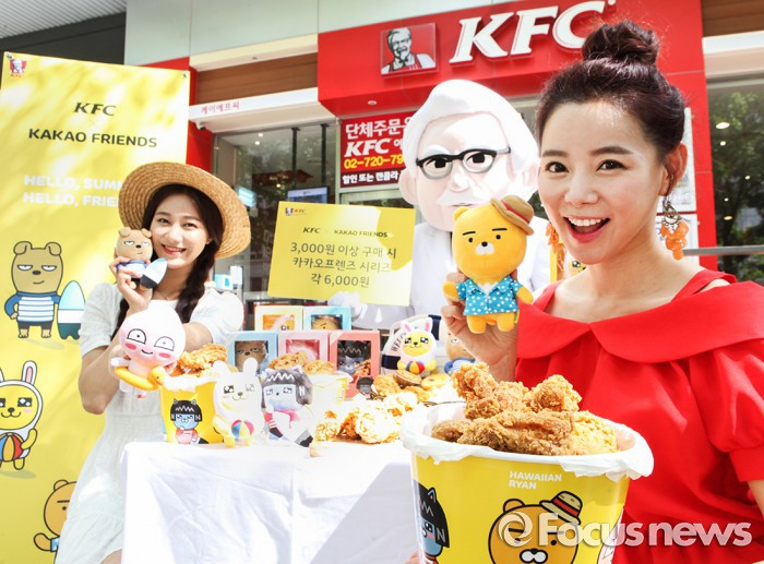 KFC 마케팅 담당자는 “여름 휴가철을 맞아 방문객들에게 특별한 혜택을 제공하기 위해 카카오프렌즈와 손을 잡게 됐다”며 “남녀노소에게 큰 사랑을 받고 있는 캐릭터인 카카오프렌즈 시리즈를 통해 많은 소비자들이 즐겁고 신나는 여름을 보내길 바란다”고 말했다.17일 KFC매장 앞에서 모델들이 카카오프렌즈와 협업한 한정판 인형을 선보이고 있다.<사진제공=KFC>