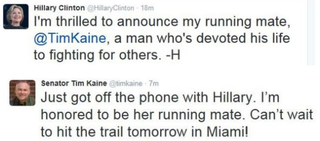 케인 의원도 트위터를 통해 클린턴의 후보 제안을 수락했다고 밝혔다. 케인 의원은 "클린턴으로부터 전화를 받았다. 그의 러닝메이트가 되는 명예를 얻었다"고 전했다.