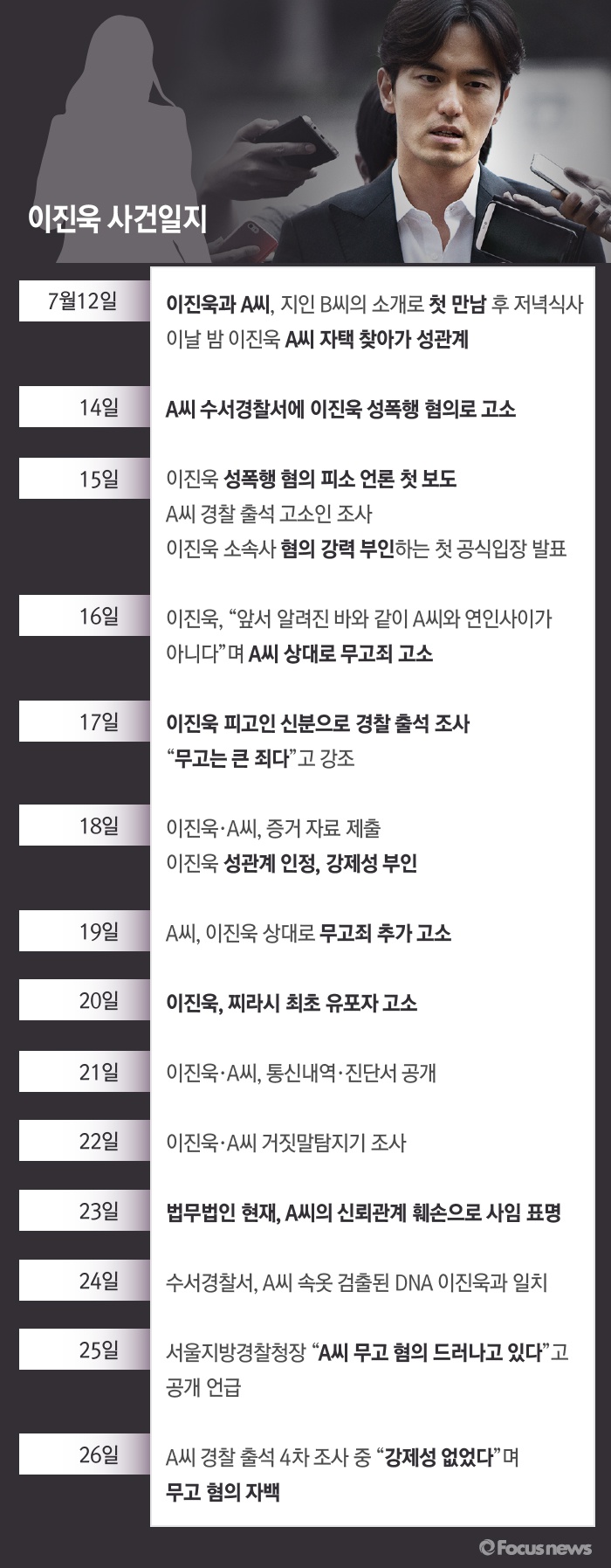 (서울=포커스뉴스) 성폭행 논란에 휩싸였던 배우 이진욱이 경찰 고소를 당한지 12일 만에 혐의를 벗었다. 이진욱을 고소한 여성 A씨는 26일 경찰조사에서 기존의 진술을 뒤엎고 "사건 당일 강제성은 없었다"고 진술했다. 이와 함께 A씨는 이진욱에 대한 '무고' 혐의에 대해서도 시인했다.