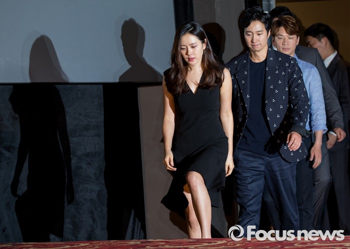 (서울=포커스뉴스) 27일 오후 서울 광진구 롯데시네마 건대입구점에서 열린 영화 '덕혜옹주' 언론 시사회에 참석한 배우 손예진(왼쪽부터), 박해일, 정상훈이 무대에 오르고 있다.