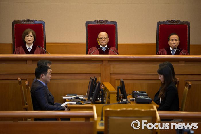 중소기업중앙회 관계자는 “소비심리 위축과 영세 소상공인의 피해를 최소화하기 위해 법률 상 ‘금품’의 범위에서 예외품목(농축수산물 유통, 화훼, 음식 등)을 설정하고, 식료품 유통업, 음식업 등 소상공인의 요구를 반영해 허용가액을 상향 조정해야 한다”고 말했다.(서울=포커스뉴스) 박한철(가운데) 헌법재판소장과 법관들이 김영란법 위헌 여부 판결을 위해 28일 오후 서울 종로구 헌법재판소 대심판정에 착석해 있다.