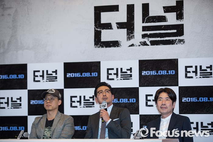 (서울=포커스뉴스) 3일 오후 서울 강남구 메가박스 코엑스점에서 열린 영화 '터널' 언론시사회에 참석한 배우 하정우(가운데)가 인사말을 하고 있다. 왼쪽부터 김성훈 감독, 배우 하정우, 오달수