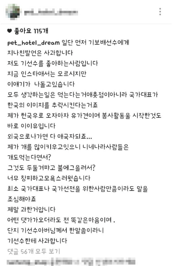이를 뒤늦게 파악한 정씨는 앞선 기 선수에 대한 욕설글 다음으로 사과글을 올리며 "기 선수 아버님께서 한 말씀이니 기선수한테 사과합니다"고 밝힌 뒤 자신의 계정을 비공개로 전환시켰다.