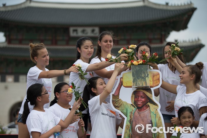 (서울=포커스뉴스) 8일 오전 서울 종로구 광화문광장에서 열린 '월드비전 2016세계어린이합창제' 런치콘서트에서 헝가리, 필리핀 어린이 합창단과 한국 월드비전 합창단이 합창을 마친 뒤 난민 아동들에게 희망을 선물한다는 의미로 꽃을 전달하는 퍼포먼스를 선보이고 있다. 올해로 6회를 맞은 '월드비전 2016 세계어린이합창제'는 'Song of Peace-평화의 노래'라는 주제로 8월 6일부터 11일까지 예술의 전당에서 열린다.